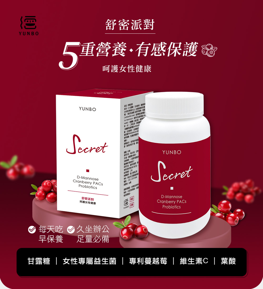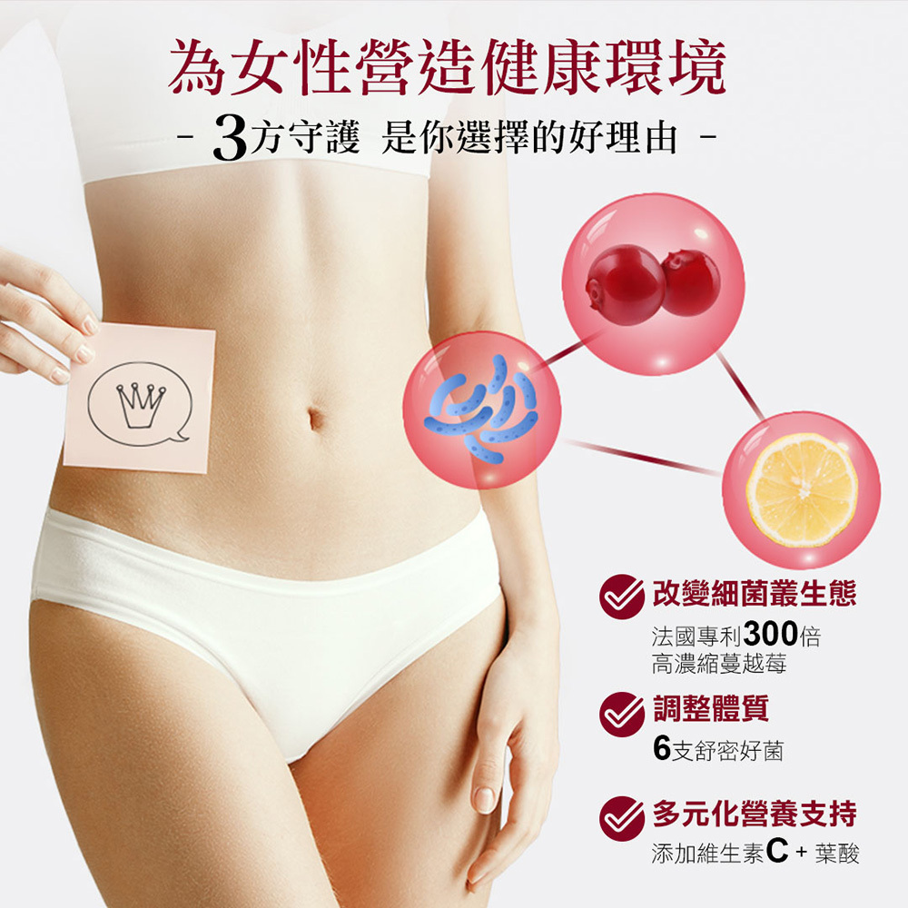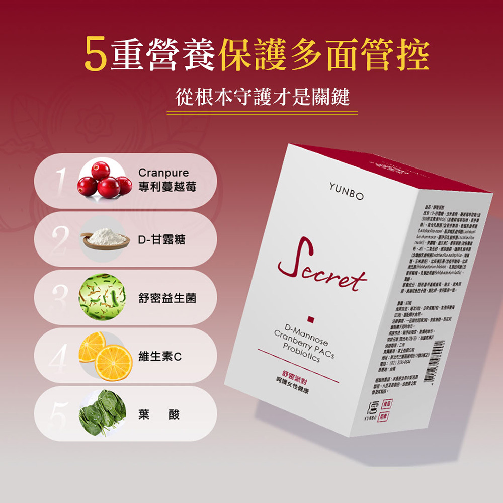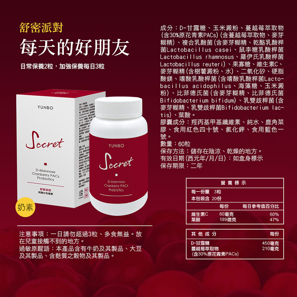 ‧ 成分:D-甘露糖、玉米澱粉、蔓越莓萃取物(含30%原花青素PACs)(含蔓越莓萃取物、麥芽糊精)、複合乳酸菌(含麥芽糊精、乾酪乳酸桿菌Lactobacillus.casei、鼠李糖乳酸桿菌Lactobacillus.rhamnosus、羅伊氏乳酸桿菌Lactobacillus reuteri)、果寡糖、維生素C、麥芽糊精(含樹薯澱粉、水)、二氧化矽、硬脂酸鎂、嗜酸乳酸桿菌(含嗜酸乳酸桿菌Lactobacillus.acidophilus、海藻糖、玉米澱粉)、比菲德氏菌(含麥芽糊精、比菲德氏菌Bifidobacterium.bifidum)、乳雙歧桿菌(含麥芽糊精、乳雙歧桿菌Bifidobacterium.lactis)、葉酸。