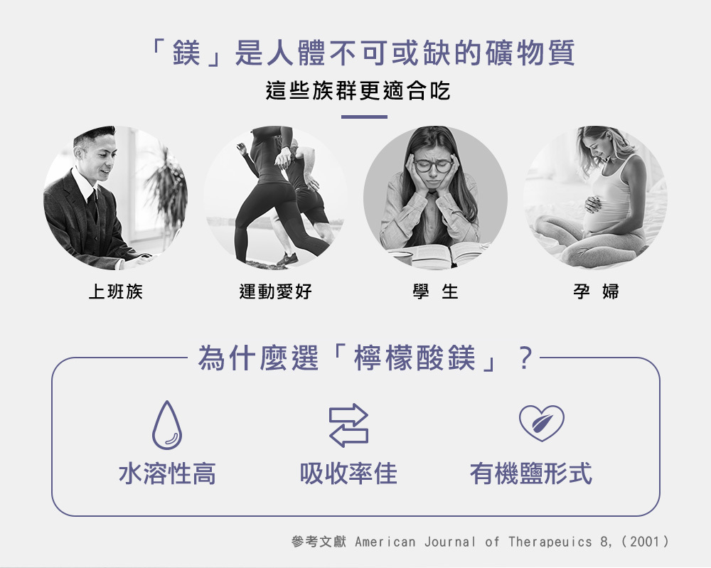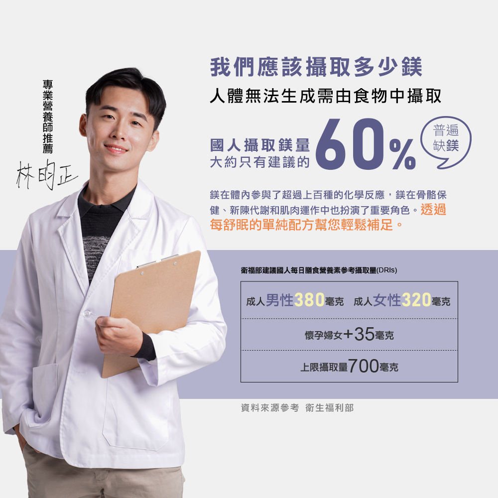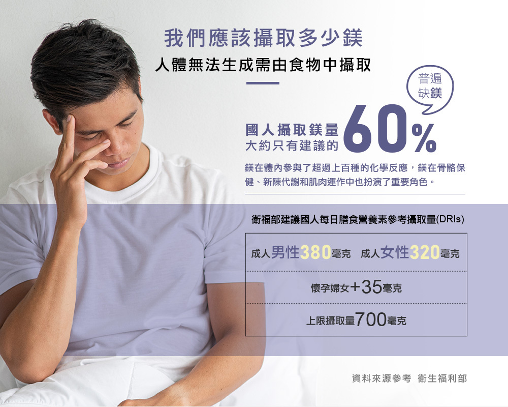 根據衛福部的每日建議食用量,14歲男性的鎂攝取量為每日350毫克,我們的鎂每錠含有82.3毫克,鎂對身體的幫助為建構骨骼和牙齒等結構,也與體內的各種生化反應有關,同時也能協助放鬆肌肉與神經喲~