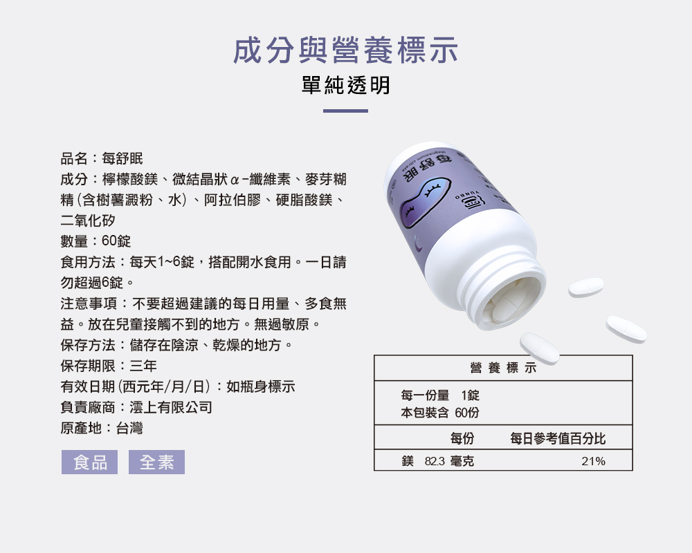 ‧ 成分:檸檬酸鎂、微結晶狀α-纖維素、麥芽糊精(含樹薯澱粉、水)、阿拉伯膠、硬脂酸鎂、二氧化矽