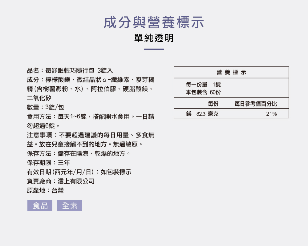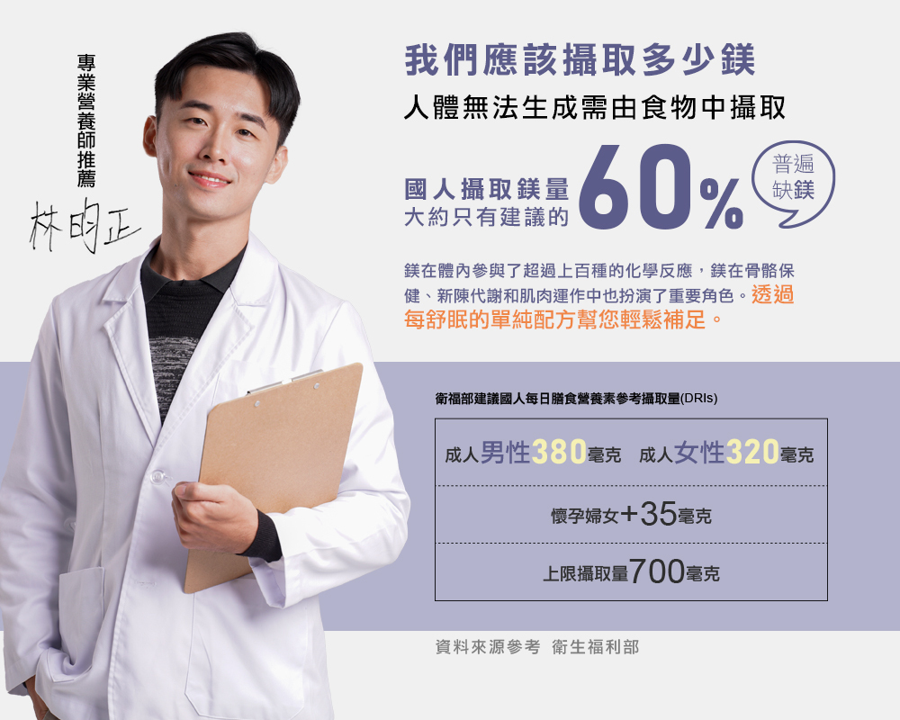 根據衛福部的每日建議食用量,14歲男性的鎂攝取量為每日350毫克,我們的鎂每錠含有82.3毫克,鎂對身體的幫助為建構骨骼和牙齒等結構,也與體內的各種生化反應有關,同時也能協助放鬆肌肉與神經喲~