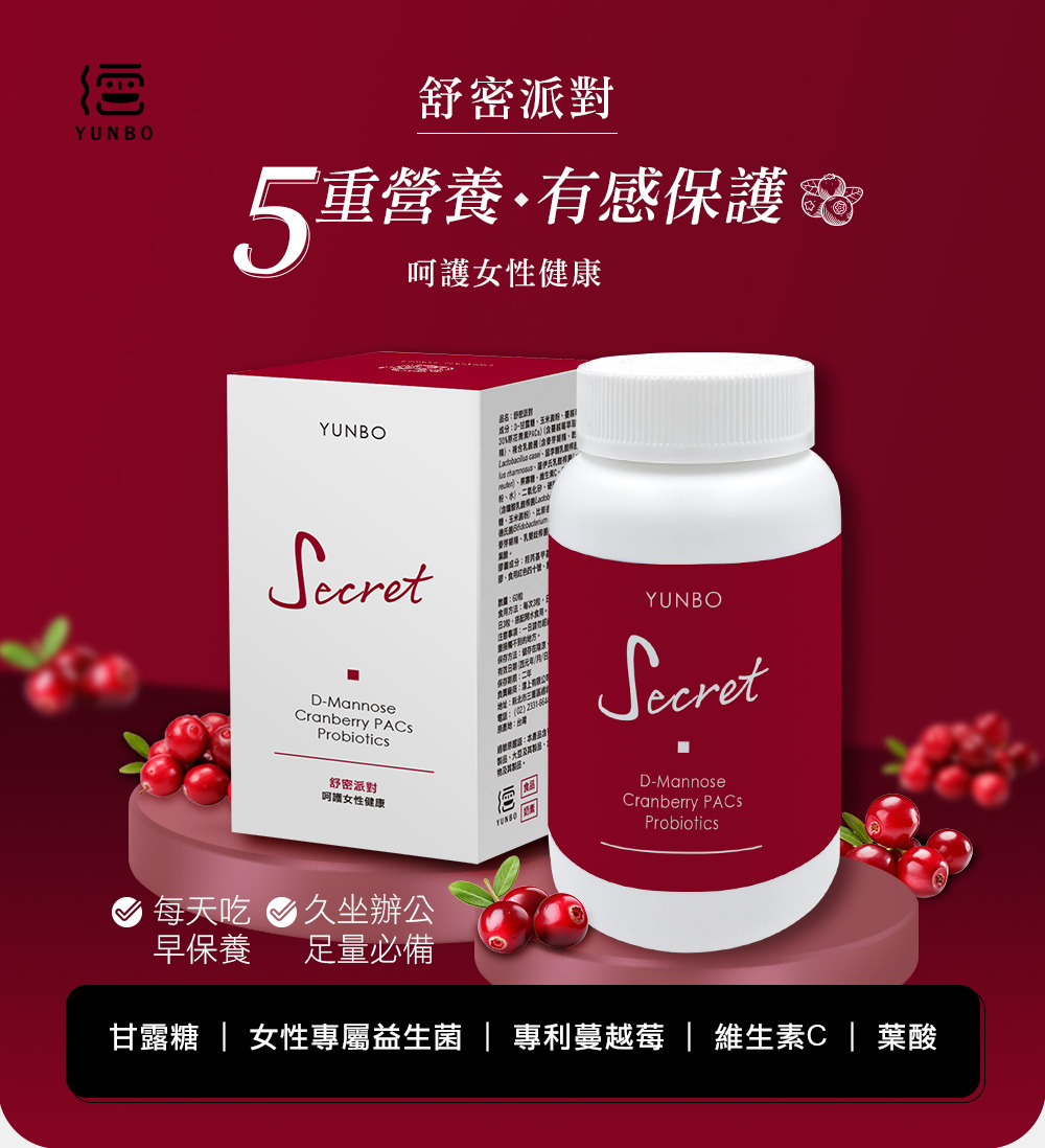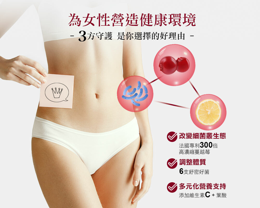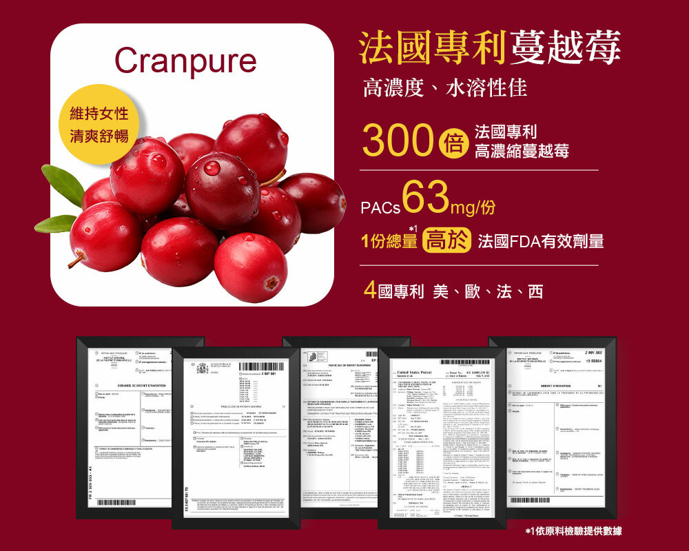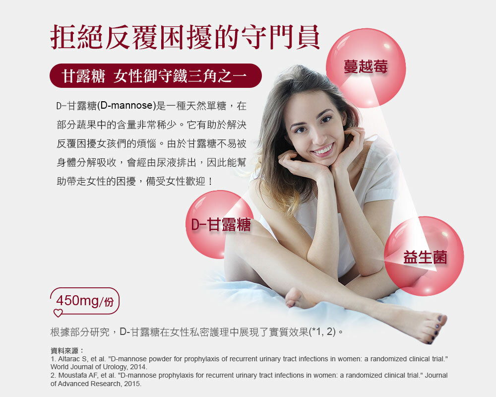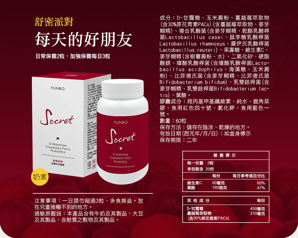 ‧ 成分:D-甘露糖、玉米澱粉、蔓越莓萃取物(含30%原花青素PACs)(含蔓越莓萃取物、麥芽糊精)、複合乳酸菌(含麥芽糊精、乾酪乳酸桿菌Lactobacillus.casei、鼠李糖乳酸桿菌Lactobacillus.rhamnosus、羅伊氏乳酸桿菌Lactobacillus reuteri)、果寡糖、維生素C、麥芽糊精(含樹薯澱粉、水)、二氧化矽、硬脂酸鎂、嗜酸乳酸桿菌(含嗜酸乳酸桿菌Lactobacillus.acidophilus、海藻糖、玉米澱粉)、比菲德氏菌(含麥芽糊精、比菲德氏菌Bifidobacterium.bifidum)、乳雙歧桿菌(含麥芽糊精、乳雙歧桿菌Bifidobacterium.lactis)、葉酸。
