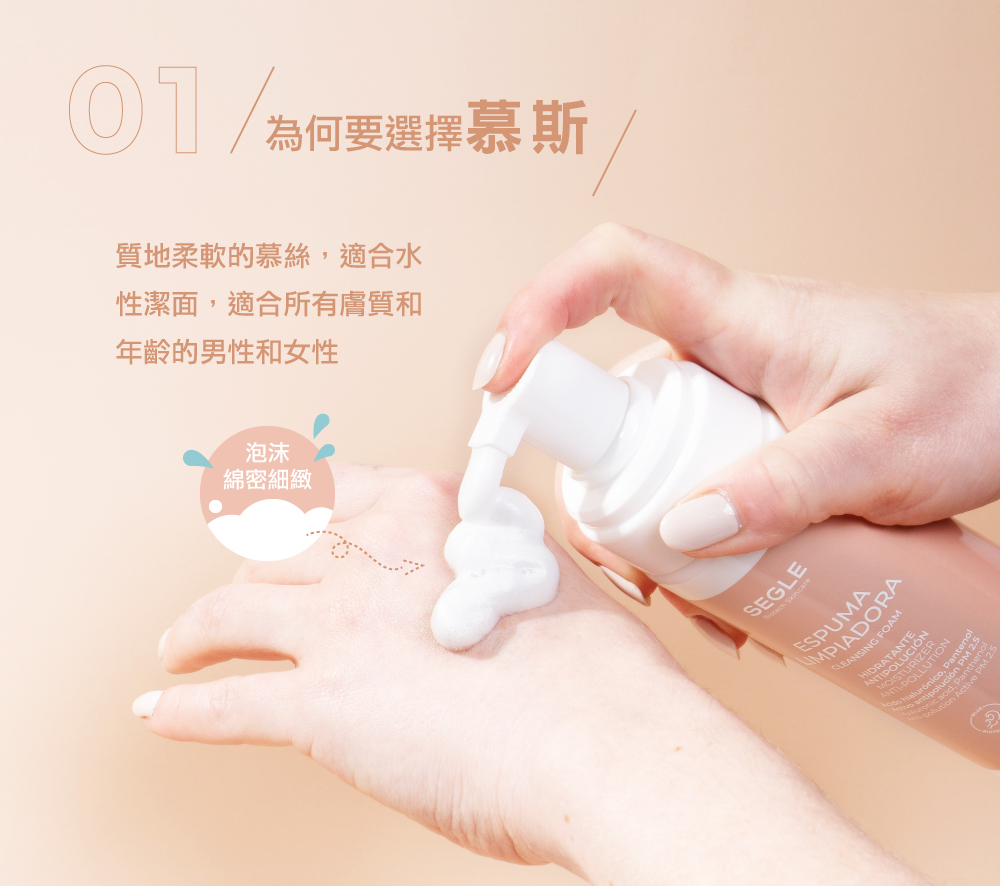 按壓適量的潔顏慕斯於掌心,指腹輕柔按摩,再以清水清洗。